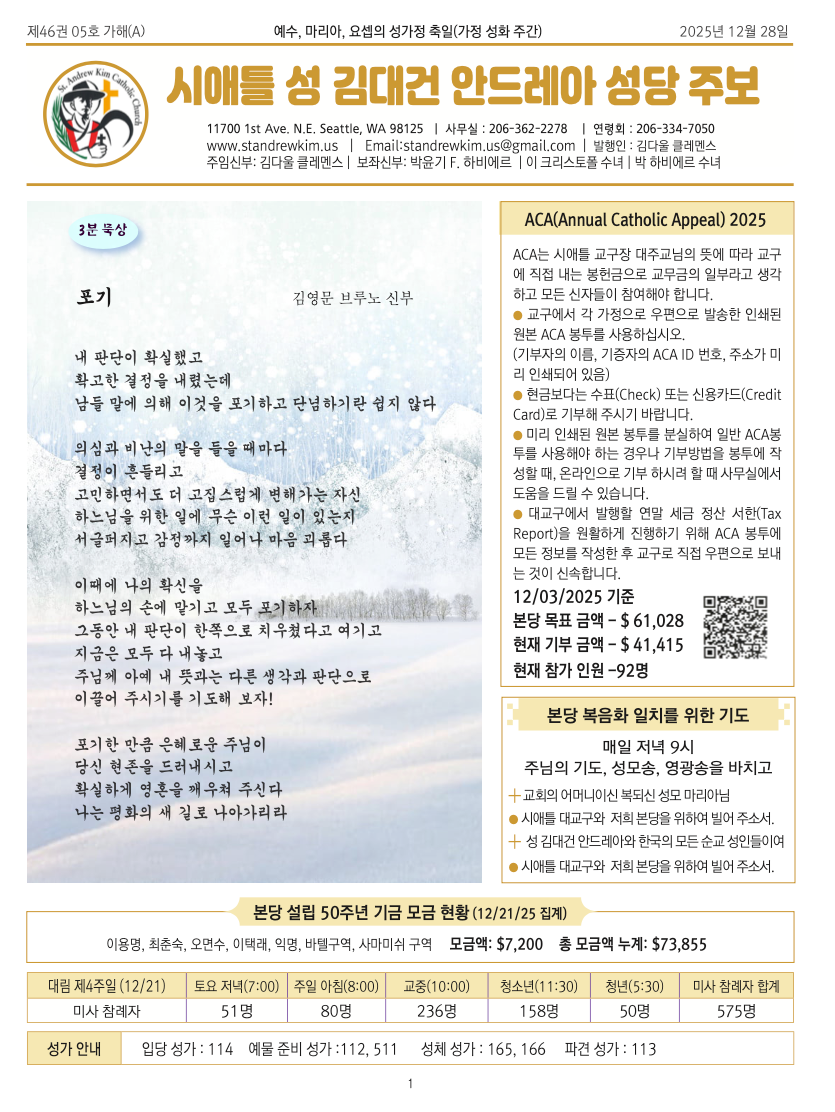 12/28, 1/4(주일)에는 11:30 미사 및 주일학교가 없습니다.