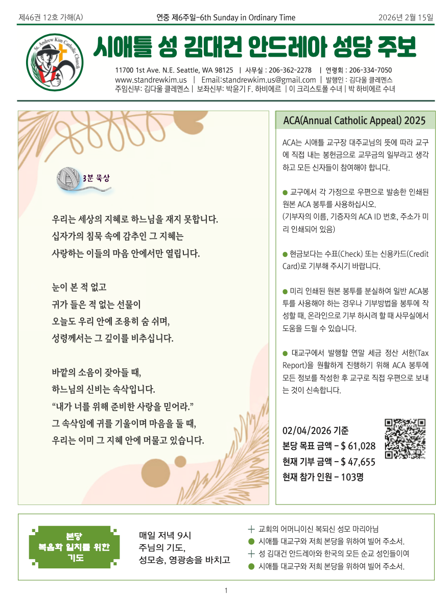 일시 : 2/15(주일) 오전 9시30분/연도, 오전 10시 교중미사